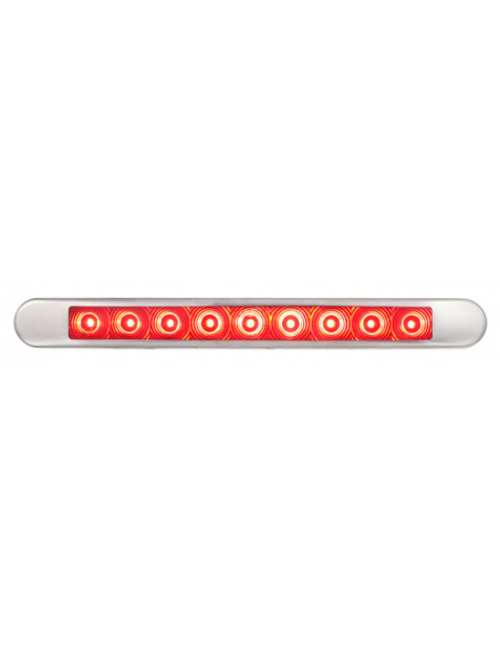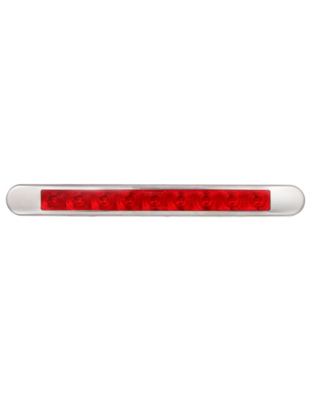 Piloto trasero LED 12/24V rojo con marco de acero inoxidable ideal para Autobús, autocar y vehículo de recreo (caravana, autocaravana, motorhome) - 190mm de cable para conexión - Funciones posición y freno - Montaje en superficie - Diseño súper delgado de 12mm - Combinable con el resto de productos de su categoría - Cumple normativas ECE, IP67